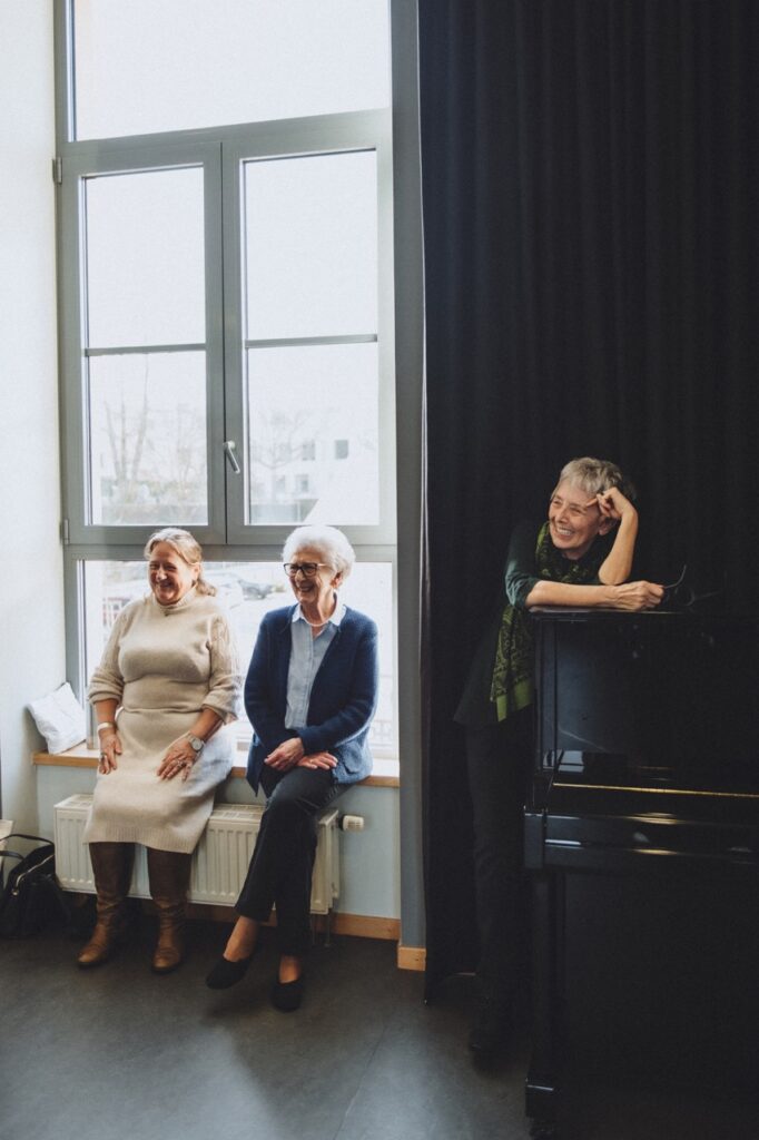 D’Cathy, ausgebilte Clownin, bréngt Laachen net nëmmen an den Theaterfoyer, mee och a Klinicken an Associatiounen. D’Christiane, d’Manon a d’Marlyse sinn och aktiv a Gesangsveräiner, an dacks gi bei de Virstellunge Repertoiren, Nouten a Melodien diskutéiert. E bësse potere virun oder no der Virstellung ass Deel vum Erliefnis.